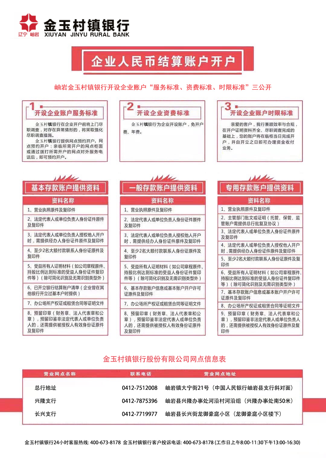 岫巖金玉村鎮(zhèn)銀行開設企業(yè)賬戶“服務標準、資費標準、時限標準”三公開